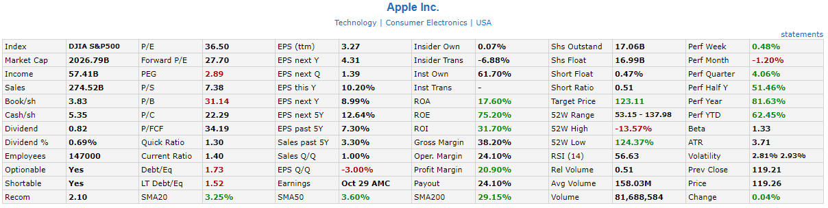 FINVIZ 주식창에 세계 1등 주식인 애플을 검색해 보도록 하겠습니다.