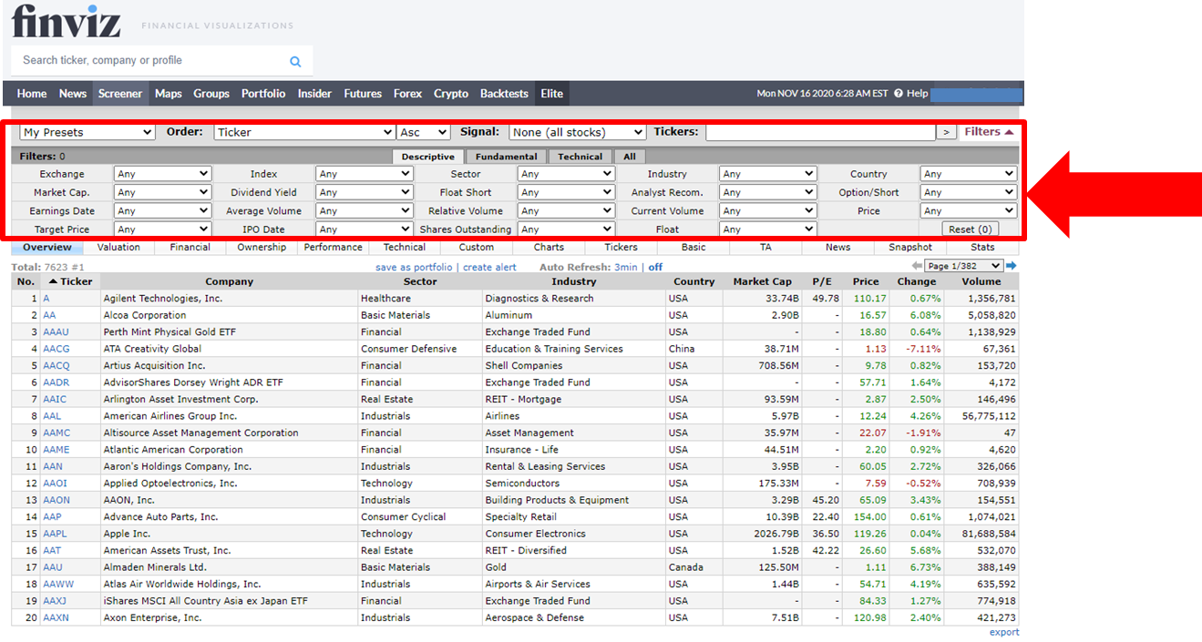 마지막으로 아래 그림의 "Screener"를 누르시면,