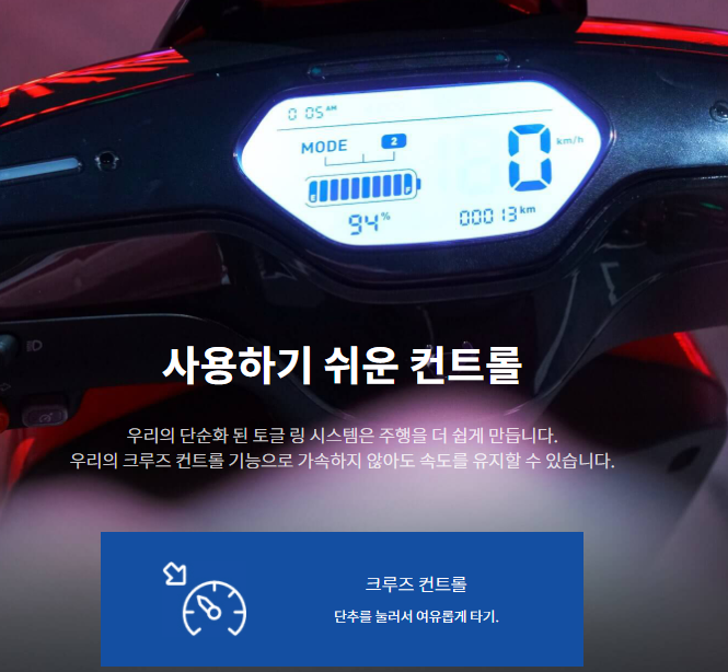 2개의 탈부착식 배터리를 활용하여 한번 충전으로 최대 130KM 까지 달릴 수 있는 모델이라고 합니다