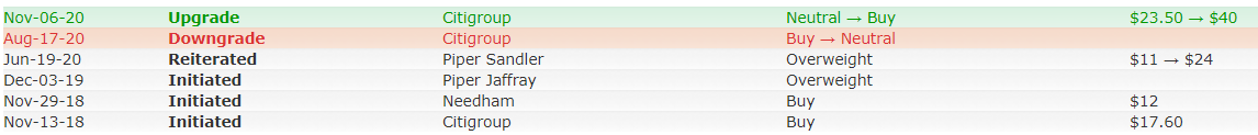 니우의 증권사 목표 주가는 가장 최근에 제시한 20년 1월 06일 시티그룹에서 40$로 목표주가를 상향 하엿으며,
