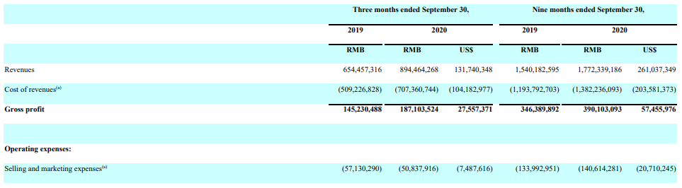 `20년 3분기 매출 : 894.4M 위안으로 1년전 같은 분기 대비 36.7%의 매출 성장을 거듭하였습니다.