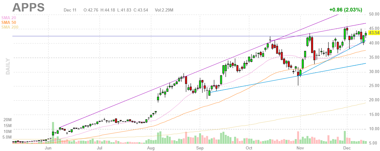 디지털터빈의 `20년 12월 12일 주가는 43.54 USD를 기록하고 있습니다.