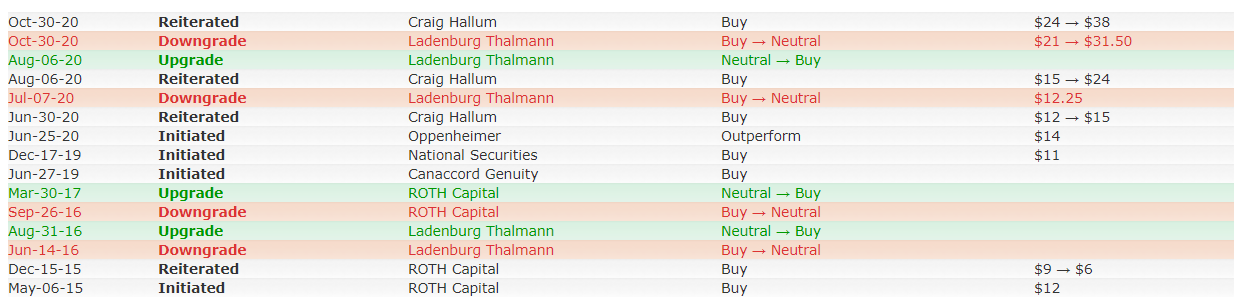 Landenburg Thalmann은 의견을 매수에서 중립으로 하향 시키긴 하였지만, 목표주가는 대신 21 USD에서 31.5 USD로