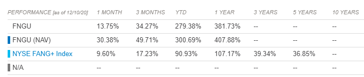 예를들어, 위 표에서 FNGU(NAV: 순자산가치)는 1년 기준 407.88 % 올랐지만, FNGU의 수익률은 381.73% 일수 있다는 것입니다.