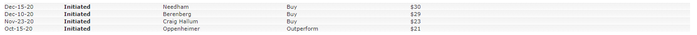 투자은행 니덤(Needham)이 `20년 12월 15일 투자의견을 Buy(매수)로 처음으로 제시하였고,