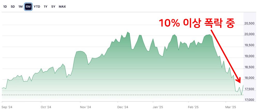 최근 잘나가던 나스닥이 최고점 대비 10% 가량 하락중입니다.