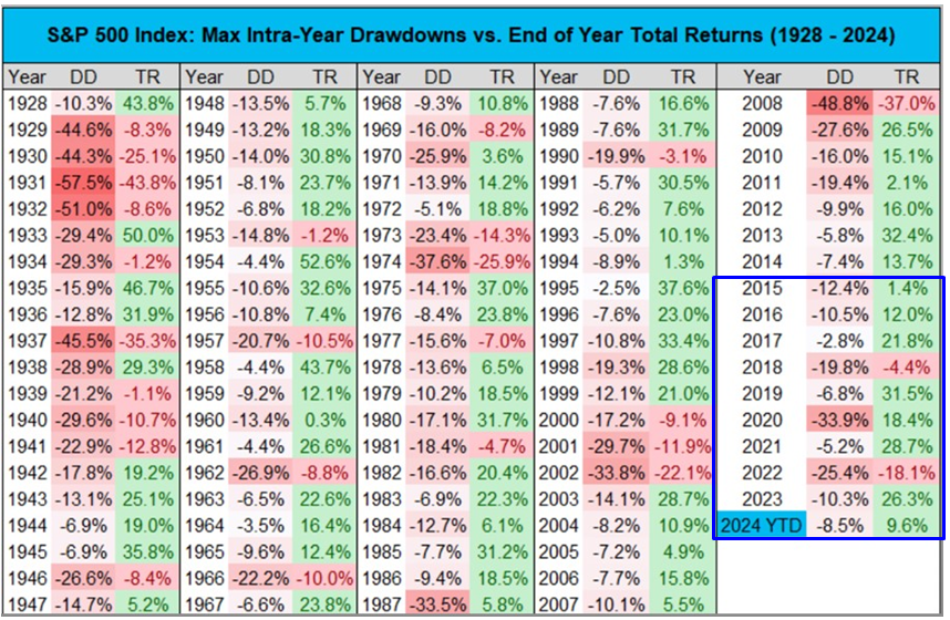이전의 과거 데이타를 참고 하면서 미래의 투자의 방향을 설정하는 것이라 판단이 됩니다. 따라서 최근 10년간 (2015-2024년) S&P 500의 DD(Draw Down, 한해 가장 많이 떨어진 구간) 을 보면 10% 조정장은 2년에 한번씩은 꼭 진행되었던 결과를 알수 있고, 이 또한 언젠가는 회복하리라는 마음가짐으로 지켜보는 것이 어떨까 개인적인 의견을 드려 봅니다.